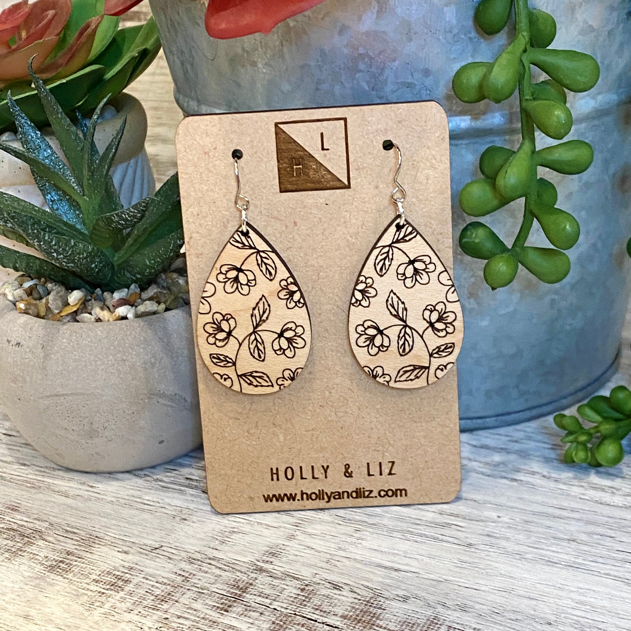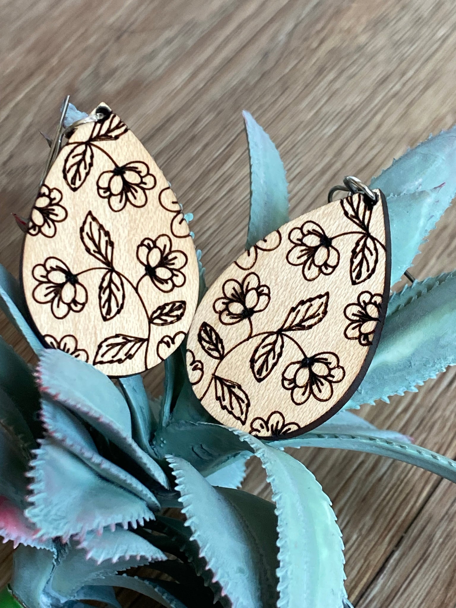 Simple yet elegant flowers on leafy vines add a touch of floral accent to any outfit! Made of laser engraved wood or acrylic, 2.25” drop length with hypoallergenic stainless steel hooks.